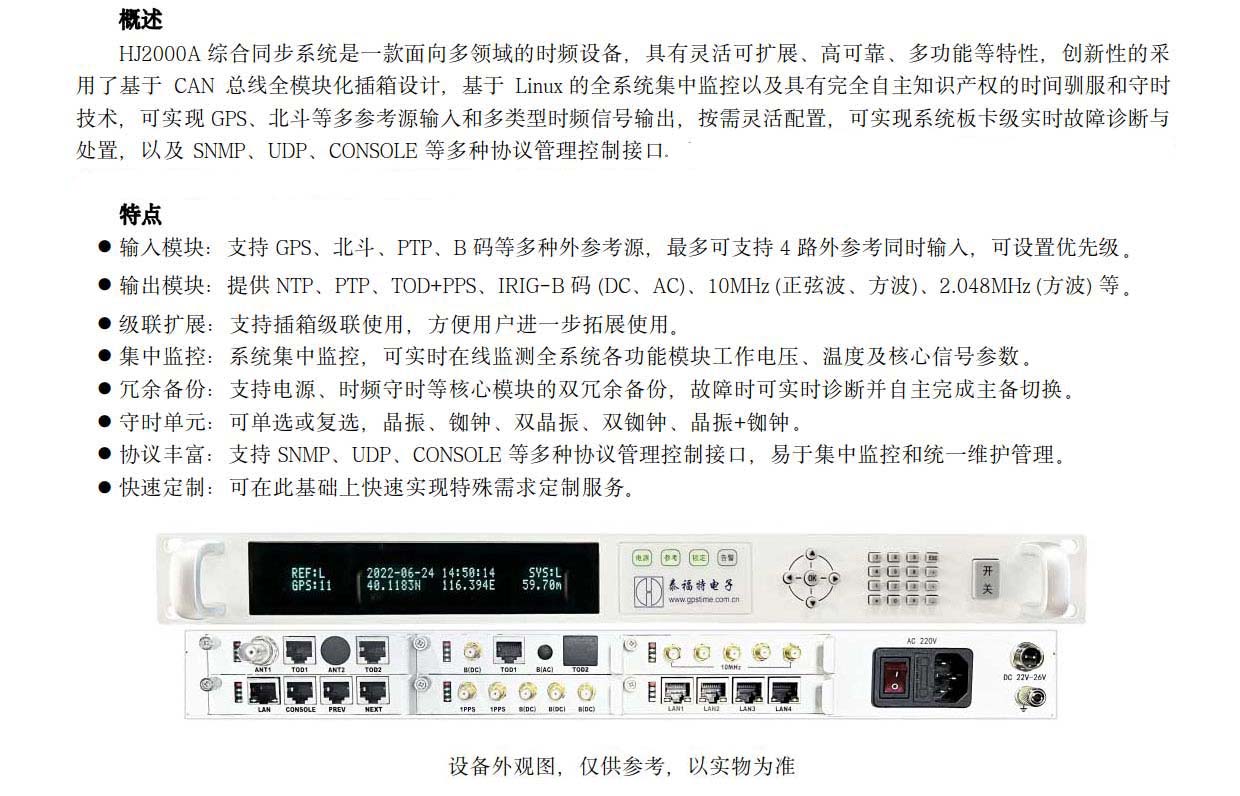 HJ2000A 綜合同步系統(tǒng)是一款面向多領(lǐng)域的時(shí)頻設(shè)備,具有靈活可擴(kuò)展、高可靠、多功能等特性,創(chuàng)新性的采用了基于CAN總線全模塊化插箱設(shè)計(jì),基于Linux 的全系統(tǒng)集中監(jiān)控以及具有完全自主知識(shí)產(chǎn)權(quán)的時(shí)間馴服和守時(shí)技術(shù),可實(shí)現(xiàn) GPS、北斗等多參考源輸入和多類型時(shí)頻信號(hào)輸出,按需靈活配置,可實(shí)現(xiàn)系統(tǒng)板卡級(jí)實(shí)時(shí)故障診斷與處置,以及 SNMP、UDP、CONSOLE 等多種協(xié)議管理控制接口,可廣泛應(yīng)用于...
